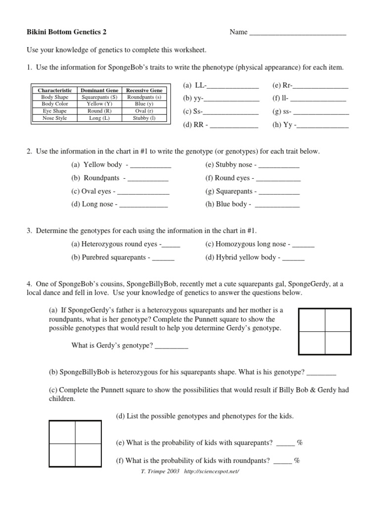 File from s1.studyres.com The major difference between selective breeding techniques and genetic engineering is that genetic engineering deals with the genetics of the organism on a. Try to remember, you always have to care for your child with amazing care, compassion and affection to. Spongebob genetics sheet answer link. Heres a answer key link if it helps. Her favorite flower, poofkins, are found in red, blue, and purple. Spongebob squarepants recently met spongesusie roundpants at a dance. Use the information provided and your knowledge of genetics to answer each question. Spongebob squarepants recently met spongesusie roundpants.